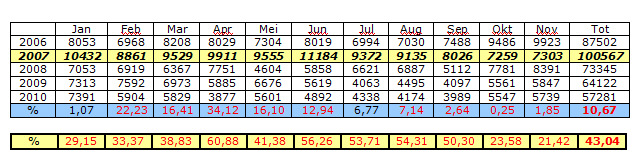 maandtonnages van 2006 tot 2010. Uit de maandpercentages (blauwe